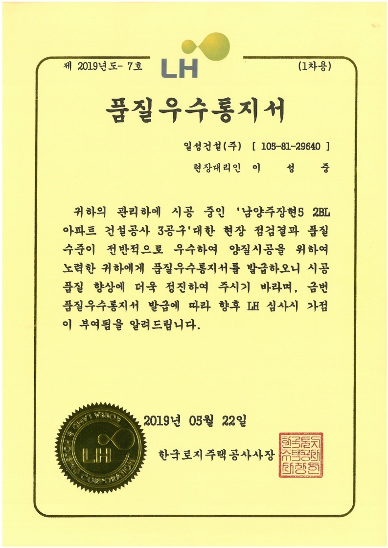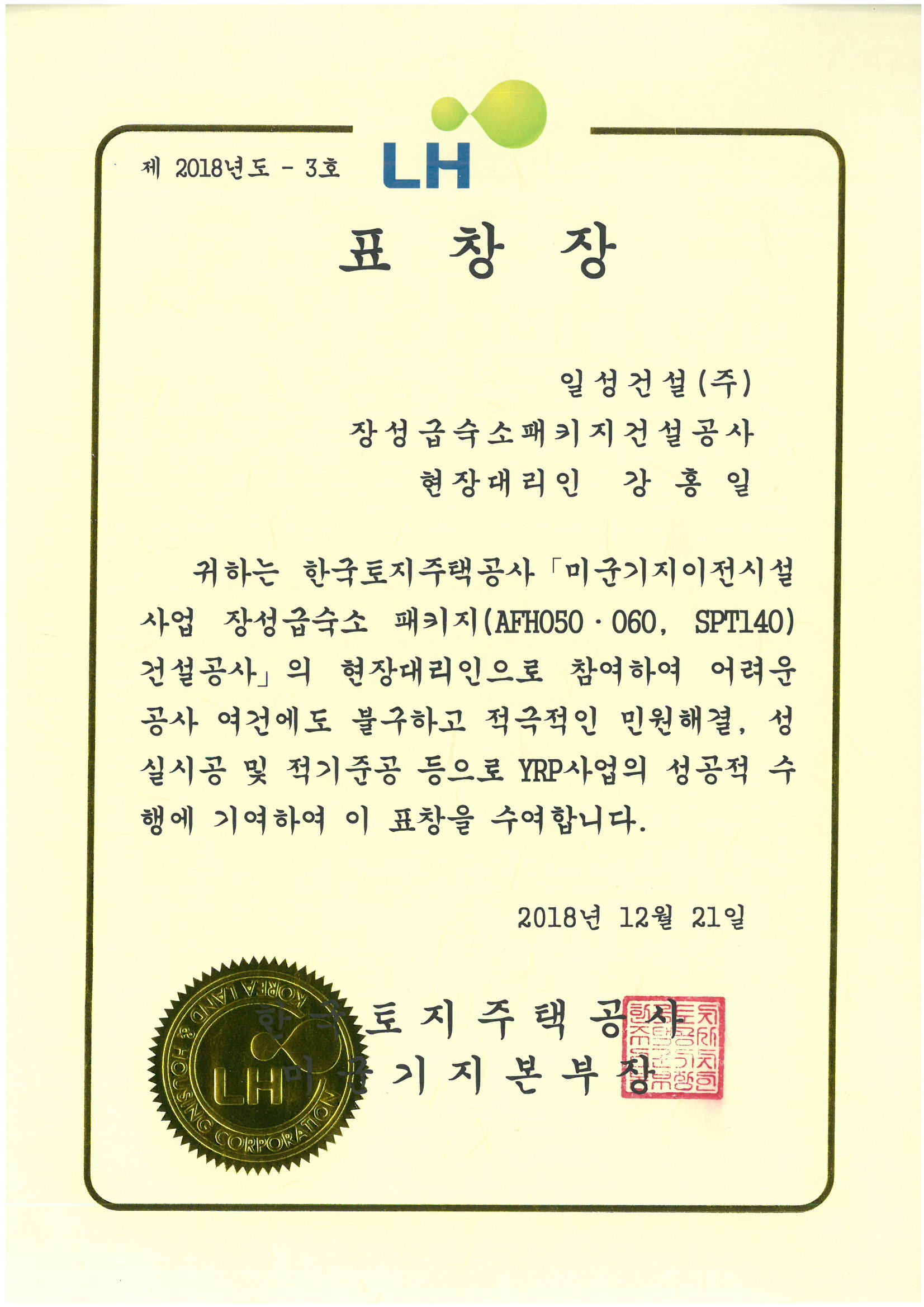 장성급숙소패키지건설공사 LH공사 표창장 수상