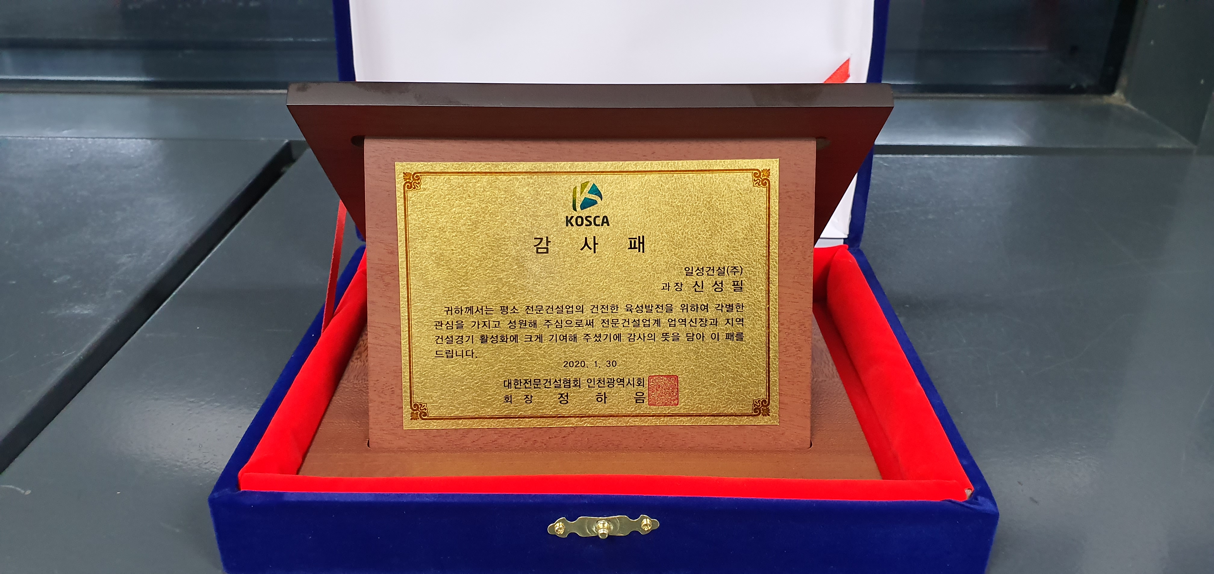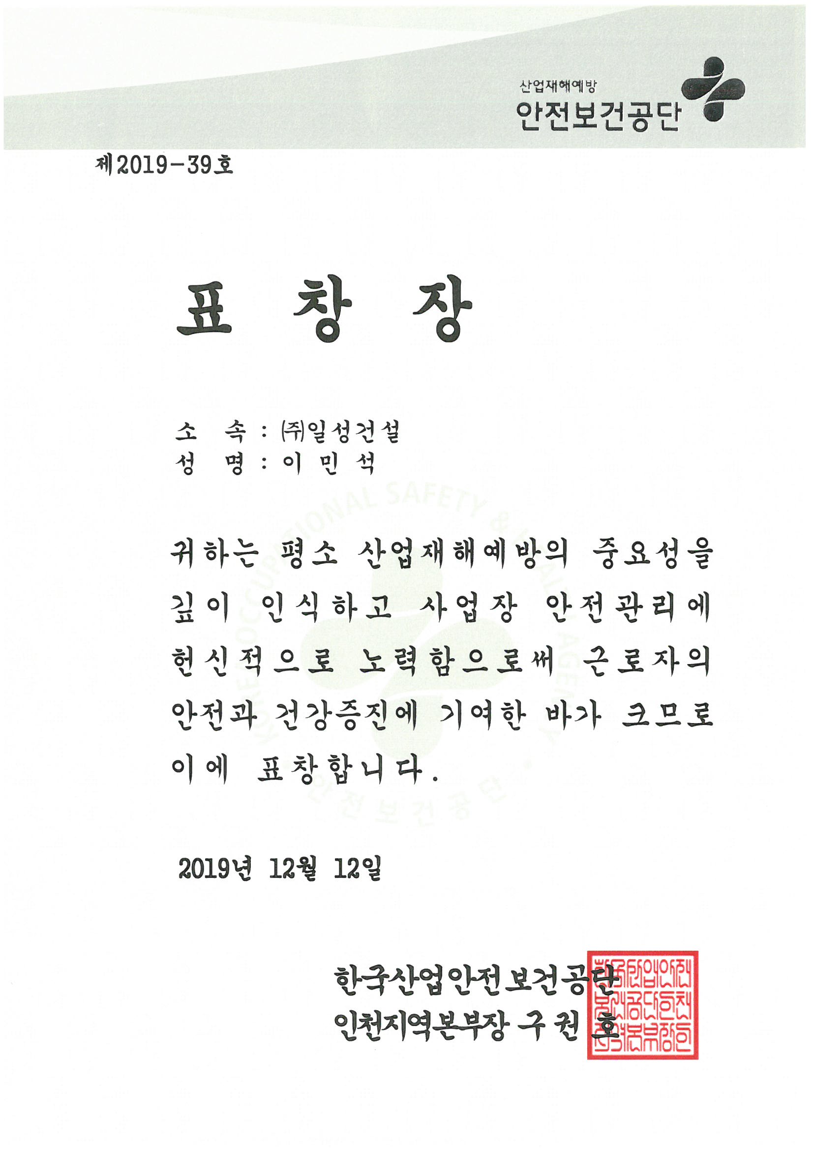 계양산 파크 트루엘 아파트공사 안전 표창장 수상