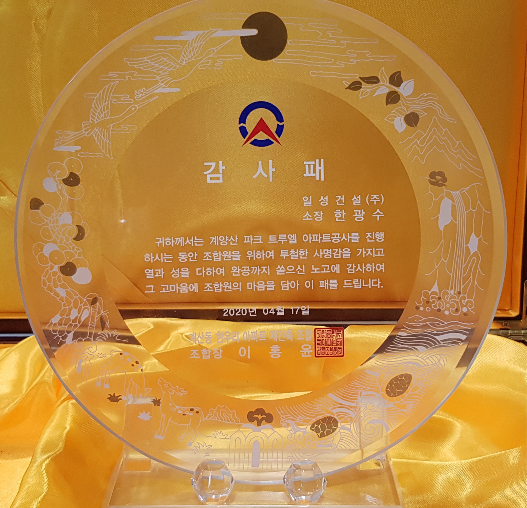 계양산 파크 트루엘 아파트공사 조합 감사패 수여