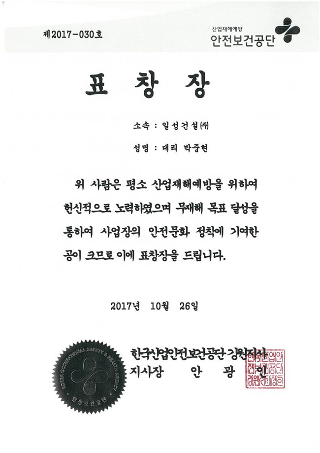 춘천 일성트루엘 아파트 1배수 인증서 및 표창장 수상