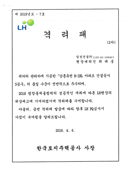 강릉유천 B-1BL 아파트 건설공사 3공구 격려패 수상