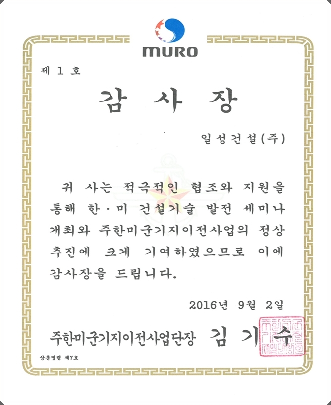 “주한미군기지 이전사업의 정상 추진 기여" 감사장 수상