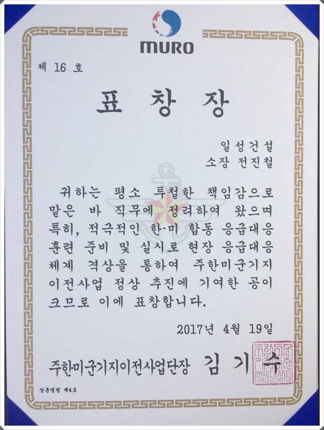 “주한미군기지 이전사업의 정상 추진 기여" 표창장 수상